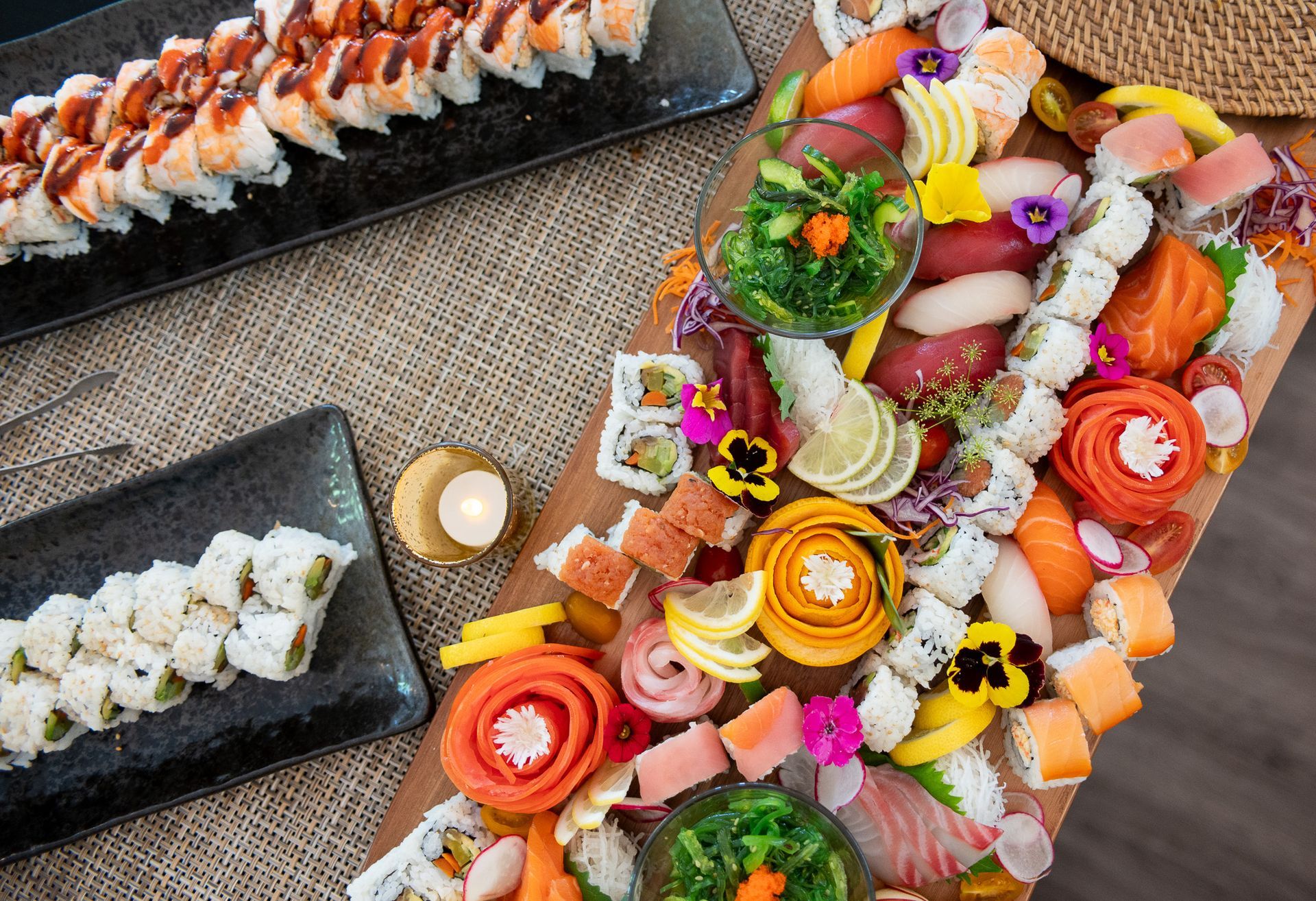 - Sushi-Cuterie Display with rolls, garnishes, sauces, and nigiri accents.